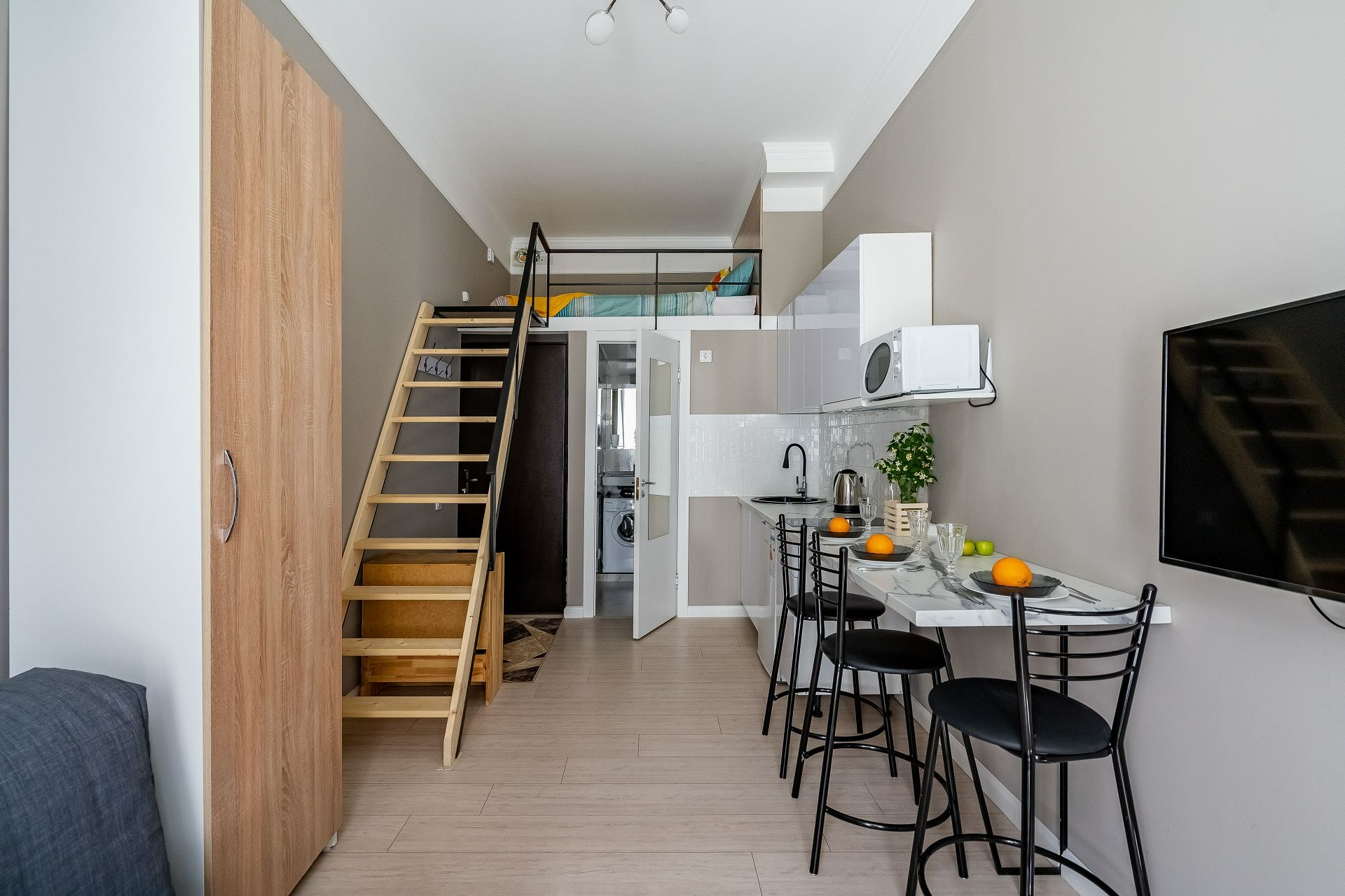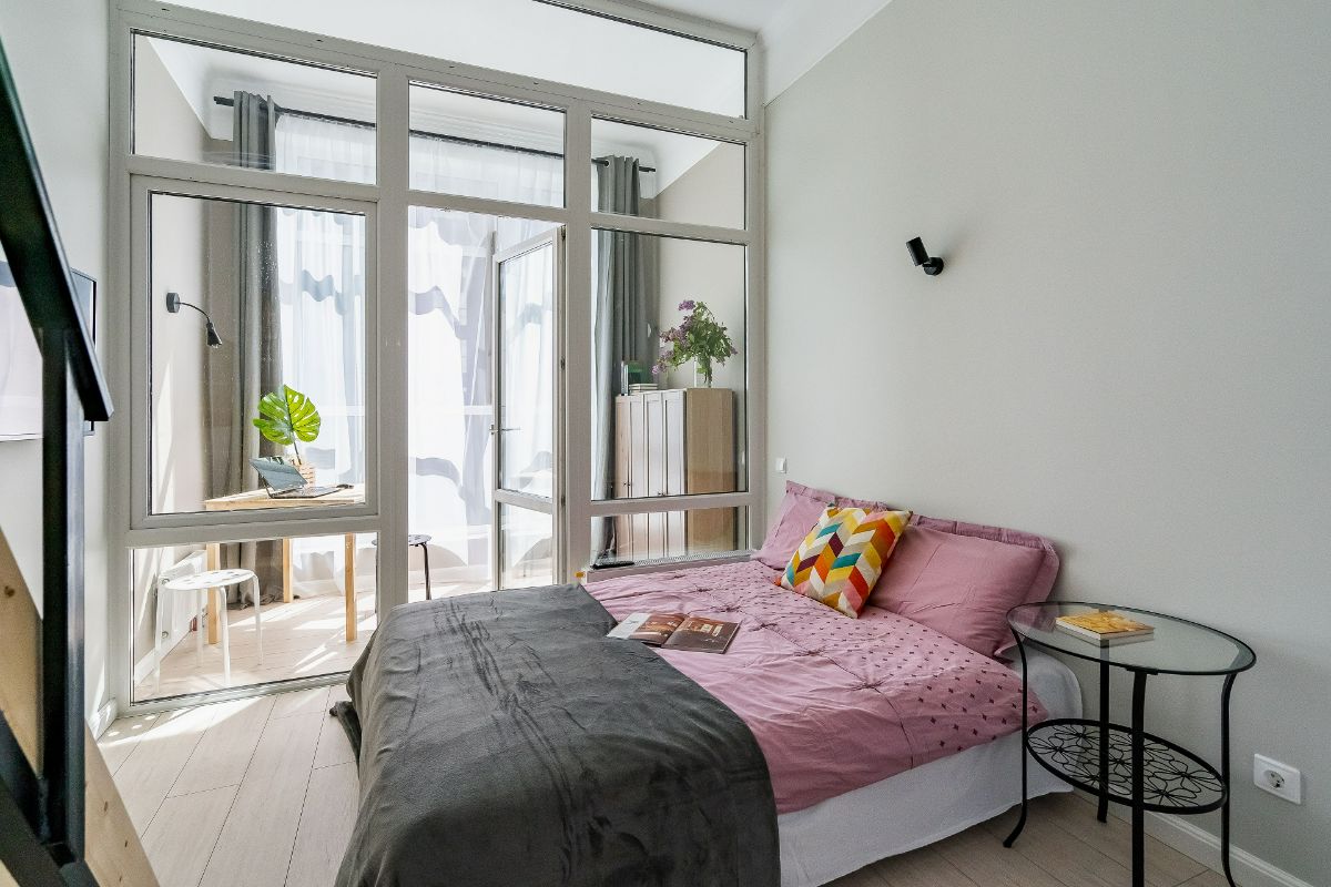 Вот, например, двухуровневая студия с остекленной лоджией-столовой на 4 гостей
